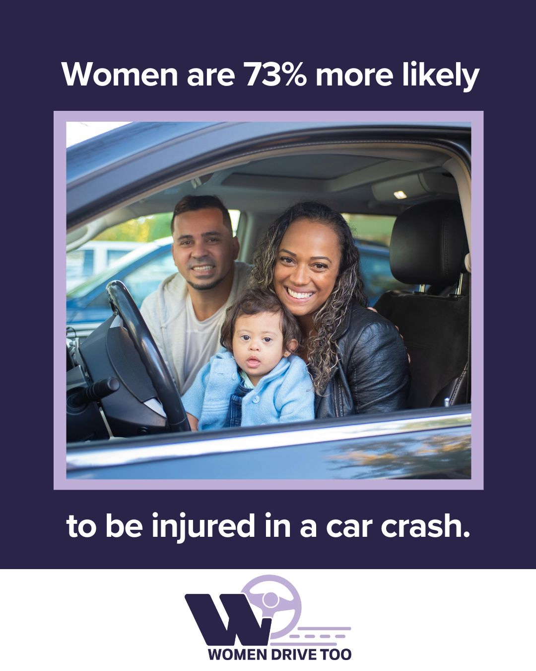In a car crash, women are 17-18.5% more likely to die and 73% more likely to sustain an injury than men, yet there is zero requirement that a female crash test dummy be tested in the driver’s seat in the federally regulated vehicle safety test, NCAP (New Car Assessment Program).